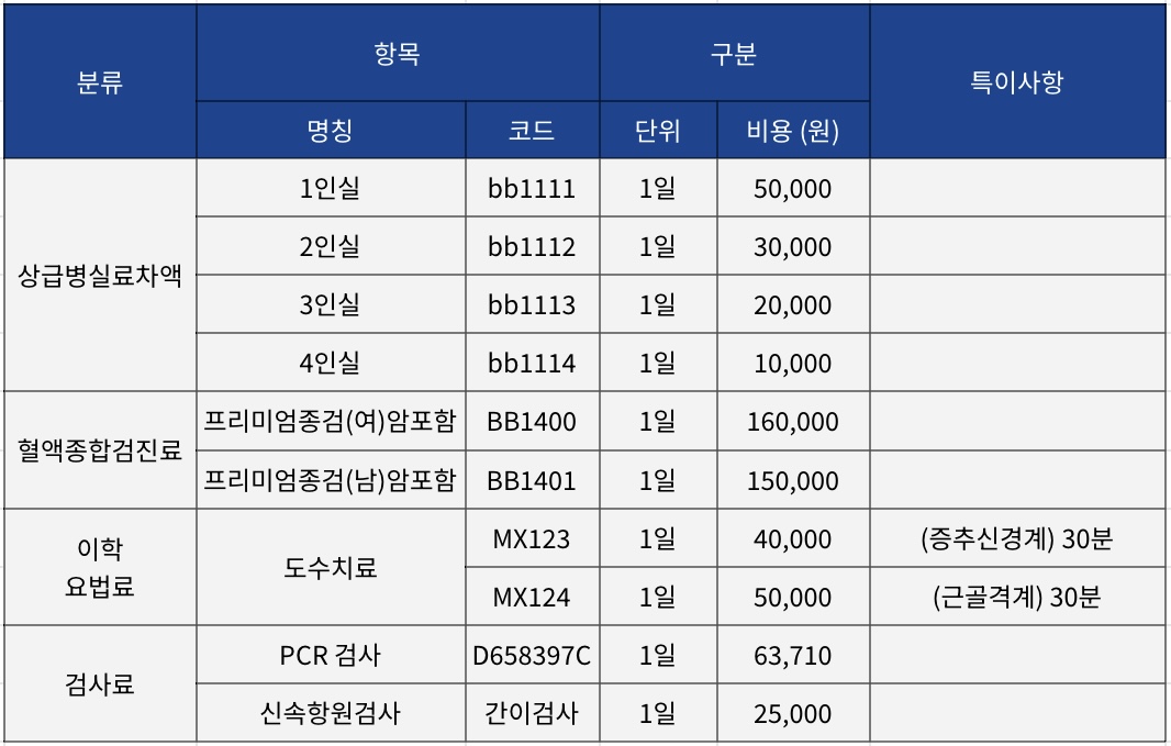 | 상급병실료차액 | 1인실 | bb1111 | 1일 | 50,000 | |